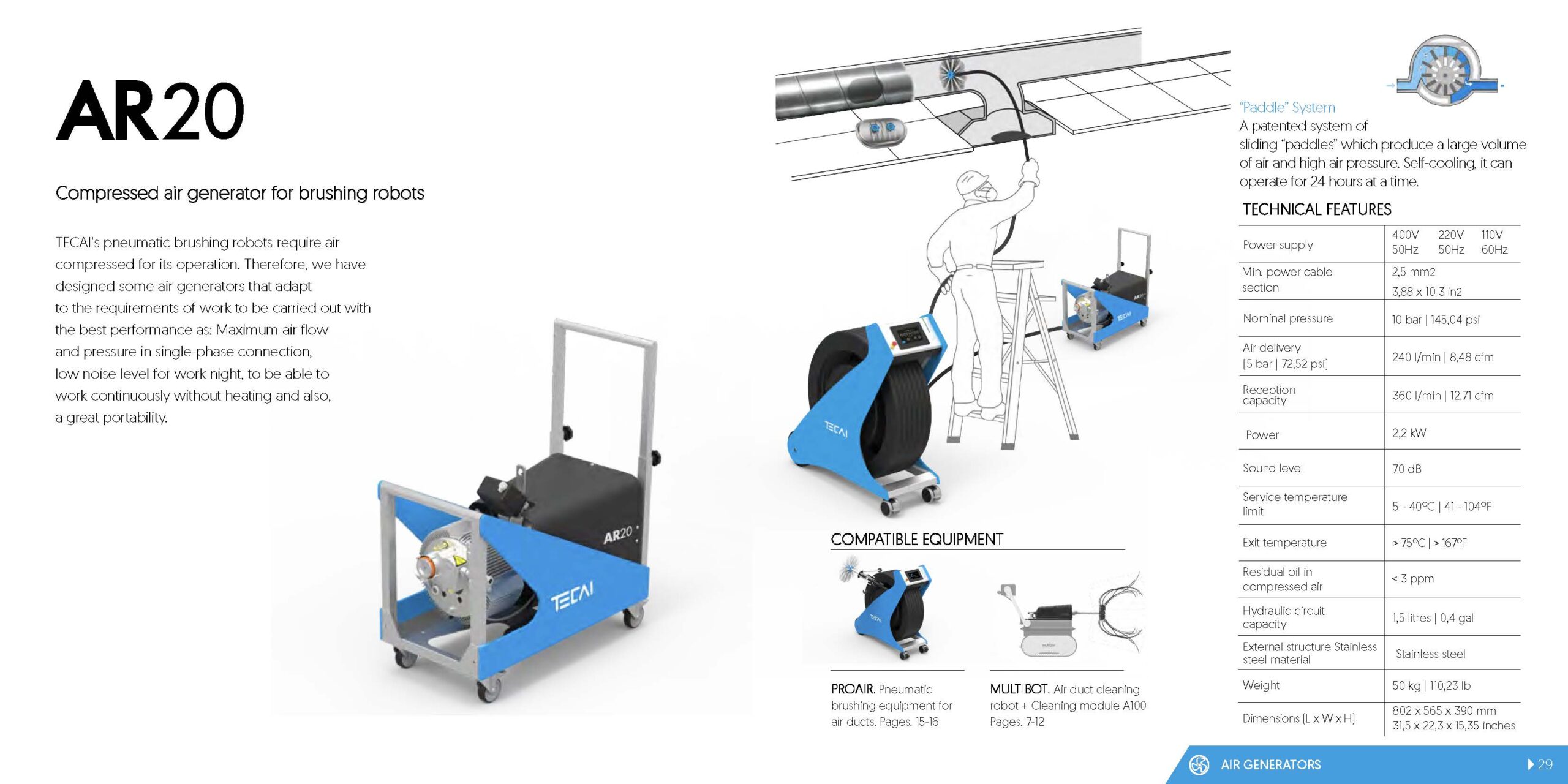 Fully compatible with Tecai pneumatic brushing machines, the AR20 delivers the airflow and pressure required for optimal duct cleaning performance, making it an essential partner for HVAC contractors and facility managers. Thanks to its innovative paddle technology, the compressor can operate continuously without overheating, guaranteeing consistent results during demanding projects.