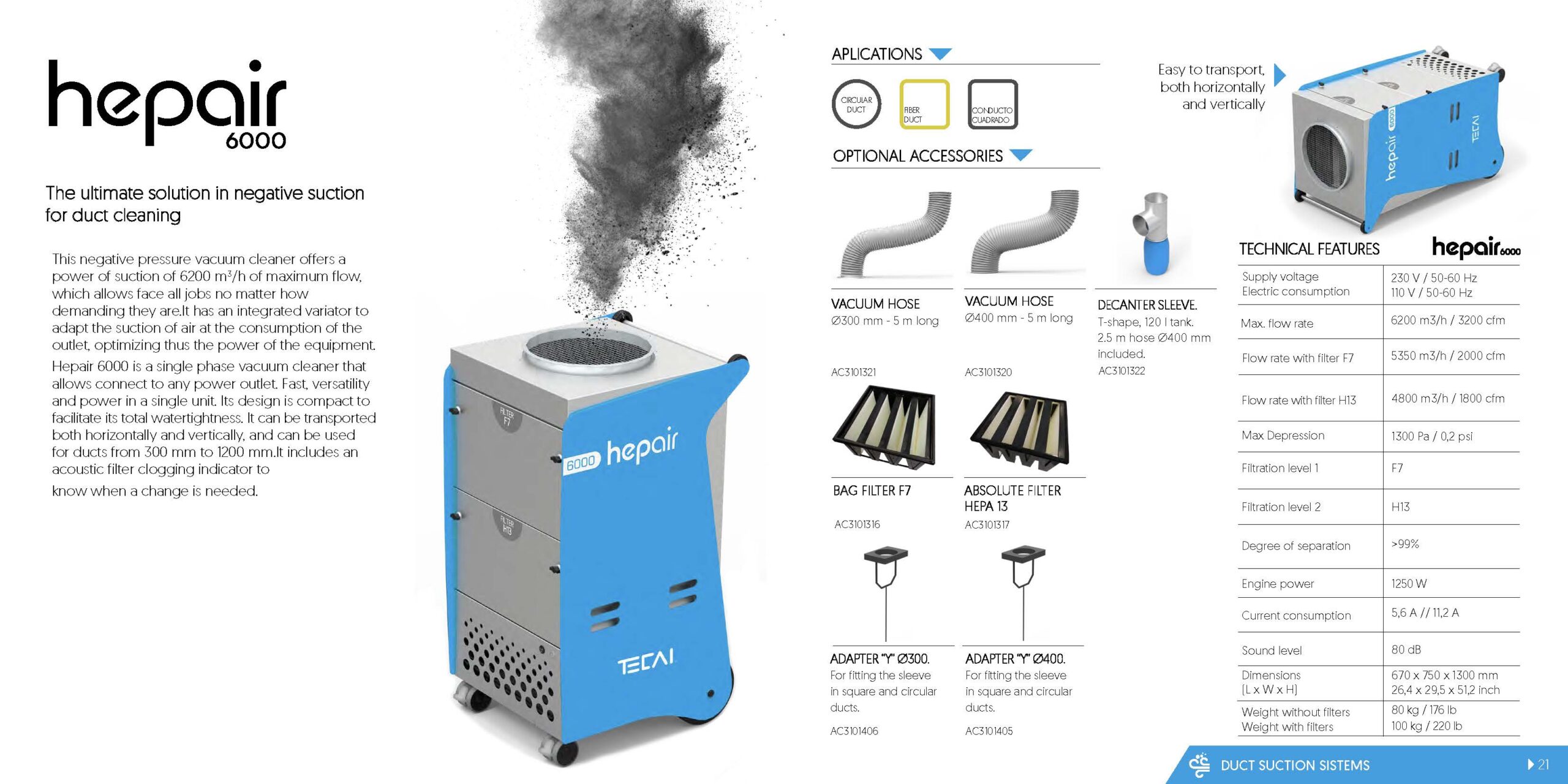 This unit is the ideal partner for the Tecai Rotair or Multibot systems. Your brushing machine loosens stubborn debris, but the Hepair 6000 acts as the “lungs”. This is because it extracts the waste in real-time. As a result, your ductwork is left visibly and microscopically clean.