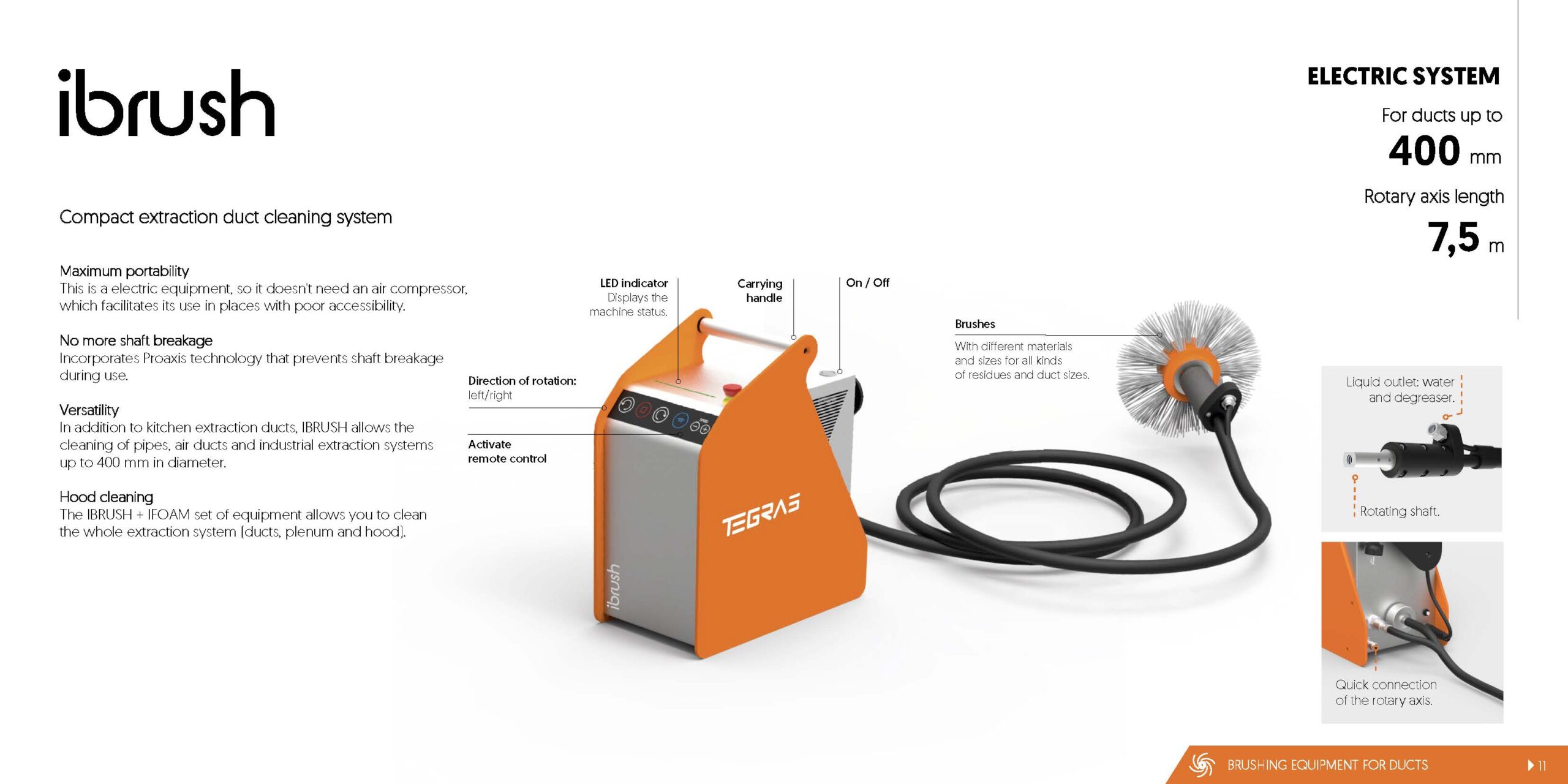 The Tegras iBrush uses compact design and an electric motor to clean kitchen extract ductwork. The iBrush is capable of cleaning kitchen extract ducts up to 400mm in size and has a reach of 7.5 metres. Ideal for the cleaning of small premises such as local take-away restaurants and chip shops. Equipped with a remote control the machine allows single operator use for more efficient cleaning.